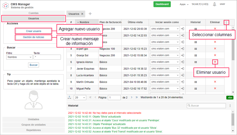 Puede gestionar usuarios en el sistema de rastreo (pestaña Usuarios) y en el sistema de gestión (sección Usuarios).