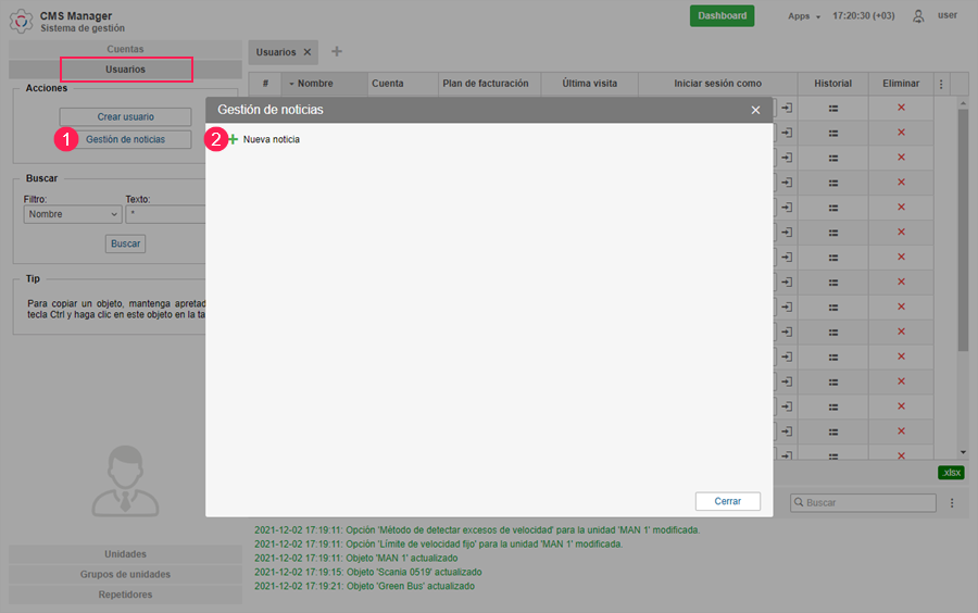 En la ventana Gestión de noticias se puede crear mensajes informativos (noticias) y enviarlos a los usuarios. Antes de iniciar el trabajo, tenga en cuenta los siguientes requerimientos: