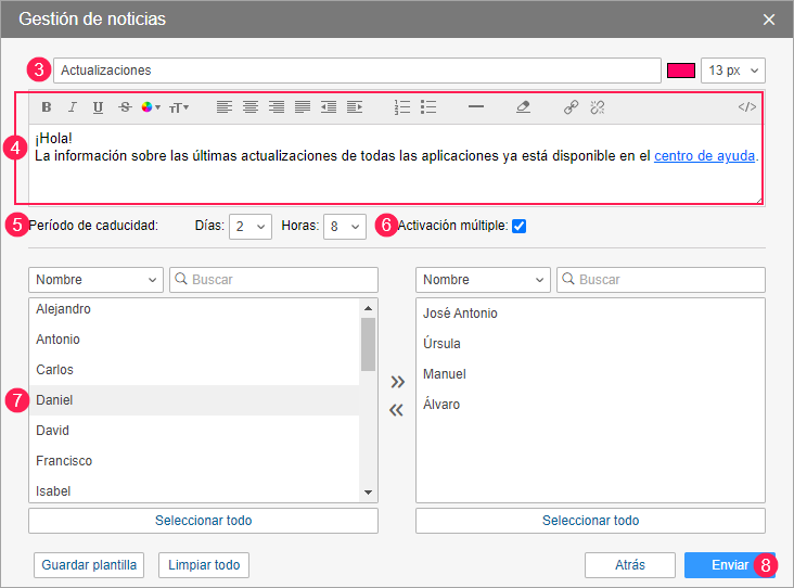 Si es necesario, active la opción Activación múltiple. Esta permite mostrar la noticia a los usuarios seleccionados durante el período de caducidad especificado al iniciar sesión. Si la opción está desactivada, la noticia se muestra una vez hasta que el usuario la cierre.