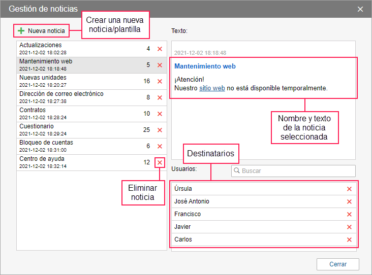 Si se elimina una noticia, esta dejará de enviarse a los destinatarios indicados.