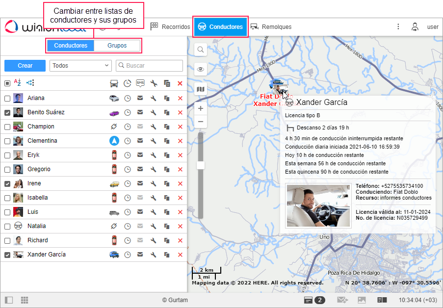 Para gestionar conductores, haga clic en la pestaña Conductores en la barra de herramientas superior o haga clic en el punto del mismo nombre en el menú principal. Para gestionar grupos de conductores, active el modo Grupos.