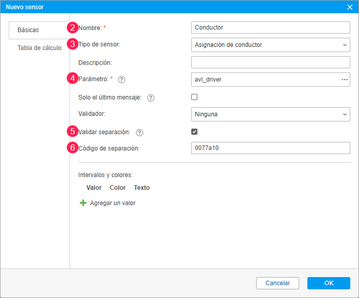 - se reciba el parámetro con el código de separación indicado en las propiedades del sensor de tipo Asignación de conductor;