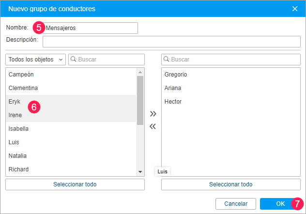 6. Escoja los conductores que deben formar parte del grupo. Para ello, seleccione los conductores en la lista izquierda y trasládelos a la lista derecha usando el icono . Para seleccionar todos los conductores, haga clic en el botón Seleccionar todo. Para seleccionar todos o varios conductores a la vez, puede emplear también combinaciones de teclas. Para agregar un conductor al grupo, haga un clic doble en su nombre.
