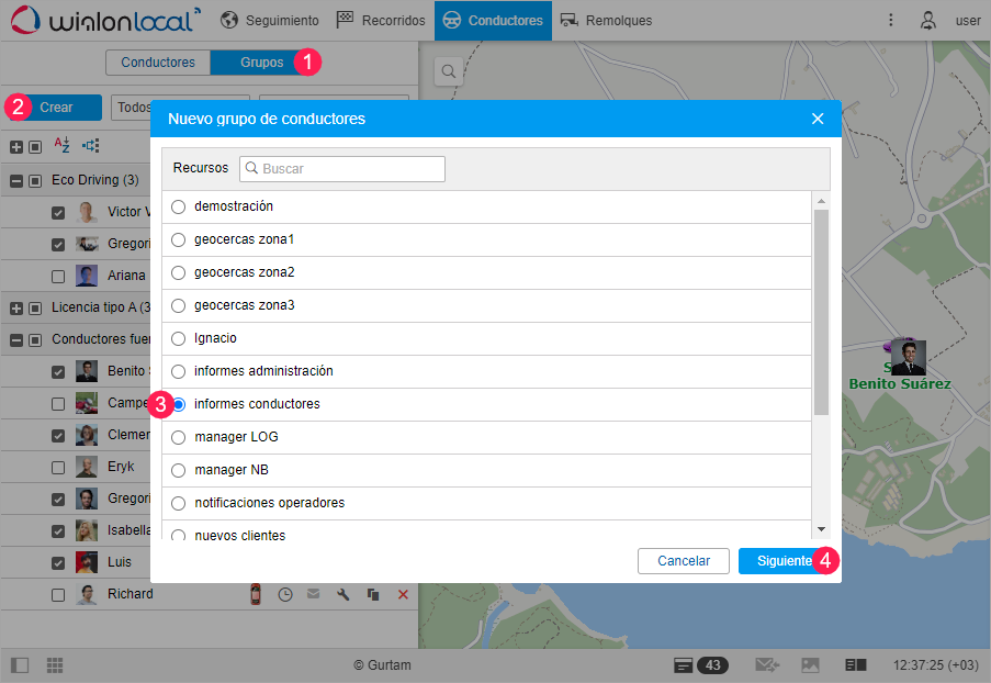 Los grupos de conductores se utilizan para unir conductores según algún criterio. Para acceder a la lista de grupos, emplee el botón en la parte superior del área de trabajo.