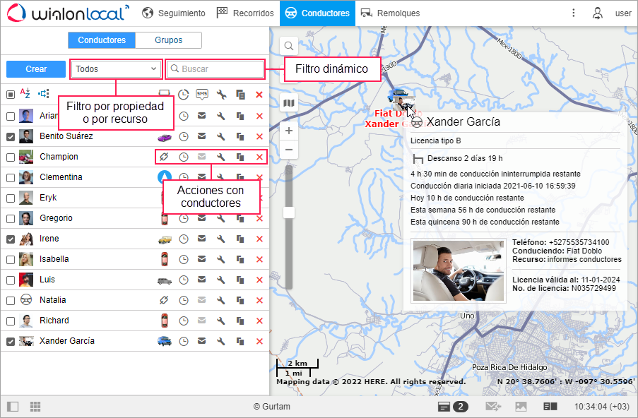Para que un conductor se muestre en el mapa, márquelo en la lista. Previamente, asegúrese de que la capa de conductores está activada.