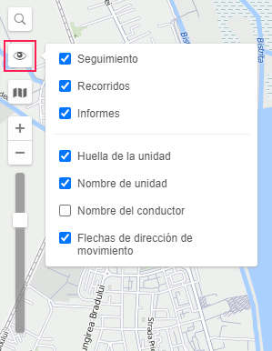 La cantidad de las bases cartográficas disponibles depende de las fuentes de mapa seleccionadas en los parámetros del usuario. Además, allí puede guardar la posición actual del mapa para los siguientes inicios de sesión. Si no tiene la opción de activar alguna fuente de mapas, contacte con el administrador de su sistema de rastreo.
