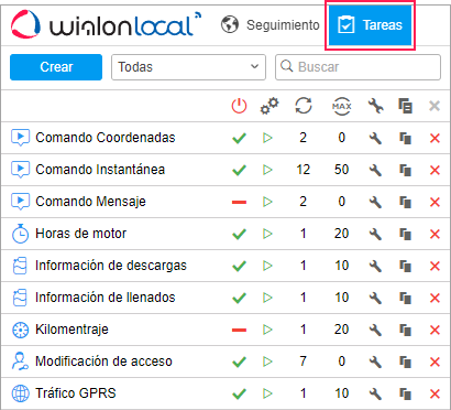 Tipo de tarea | En la primera columna (a la izquierda del nombre de la tarea) se muestra el icono que marca el tipo de la tarea: : enviar un comando; |