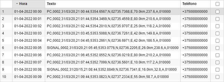 Los mensajes SMS pueden enviarse por una unidad, cuando se ejecutan comandos, en el estado de alarma y en otros casos que dependen del tipo de dispositivo usado. La tabla generada por este tipo de solicitud contiene dos columnas: la hora de enviar el mensaje y el número de teléfono de la tarjeta SIM del dispositivo del que se ha enviado el mensaje. Se puede filtrar los SMS según su texto.
