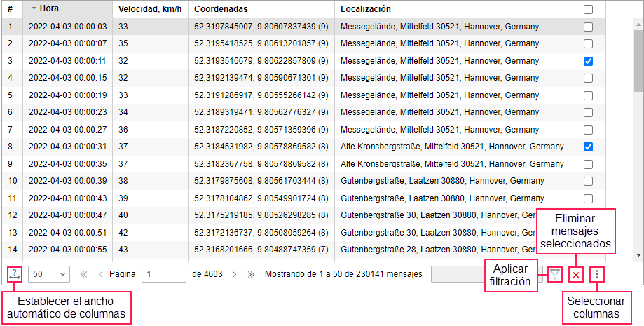 Si es necesario cargar 500 o 1000 mensajes por página, no se recomienda ampliar el ancho de las columnas automáticamente, ya que esto puede ralentizar la carga de mensajes, especialmente si la cantidad de parámetros se diferencia en varios mensajes.