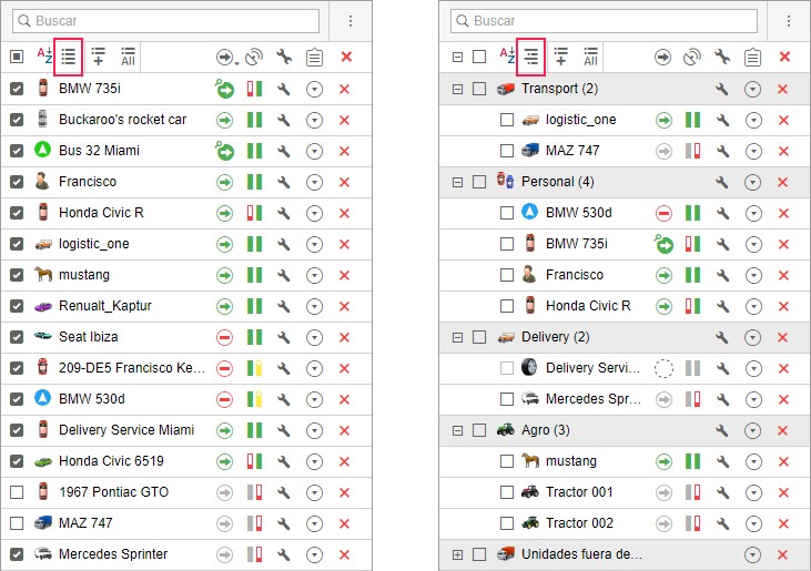 Para plegar/desplegar un grupo, es decir, plegar/desplegar la lista de sus unidades, utilice el botón más/menos en la primera columna de la lista. Para que las unidades de un grupo se muestren en el mapa, active el visto de este grupo. Para que se muestre una unidad determinada, despliegue el grupo y active el visto de esta unidad.