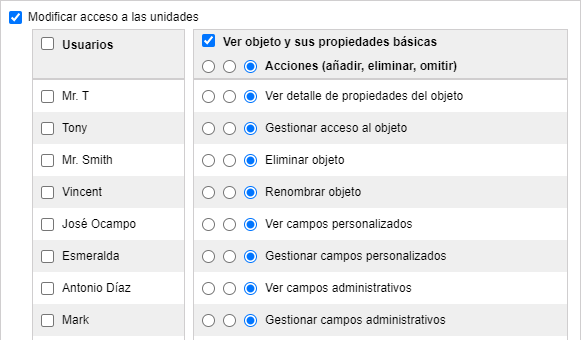 Elija a los usuarios, cuyos accesos tienen que modificarse en unas condiciones e indique para ellos nuevo conjunto de accesos. Esta opción puede ser de ayuda, por ejemplo, en la siguiente situación. Supongamos, que ha creado un usuario que sigue el movimiento de su carga, es decir, tiene accesos a unas unidades (de las que se crea una notificación). Una vez entregada la carga al lugar necesario (a una geocerca), las unidades se hacen inaccesibles para el usuario automáticamente.