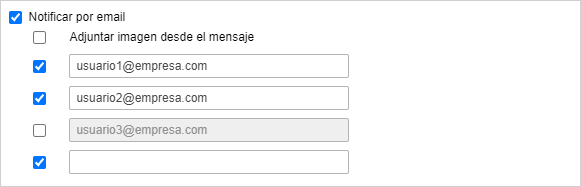 Al seleccionar esta acción, se puede agregar direcciones de correo electrónico a las que desea enviar la notificación. Para hacer esto, marque la casilla a la izquierda del campo e indique una dirección. Una vez introducida, un campo nuevo se agrega automáticamente. Para cancelar el envión de la notificación a una dirección agregada, cancele la selección a la izquierda de esta.