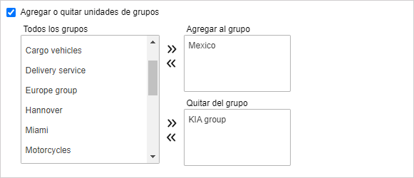 Al activarse una notificación, se puede incluir una unidad en un grupo (grupos) o excluirlo de grupos. A la izquierda se muestra la lista de grupos disponibles. De allí se puede pasarlos a la derecha: a la lista Agregar al grupo (para que al activarse la notificación la unidad se incluya en los grupos indicados) o Quitar del grupo (para que al activarse la notificación la unidad se elimine de los grupos indicados).