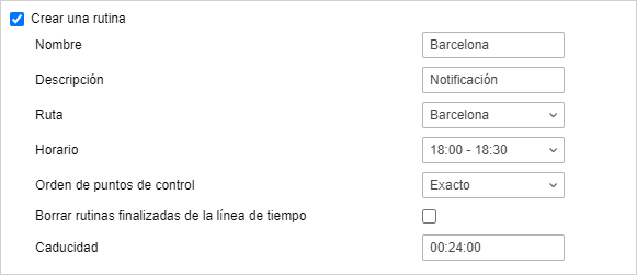 En función de acción al activarse una notificación se puede asignar una rutina nueva a la unidad. Por ejemplo, una rutina puede asignarse al salir de una geocerca, o, una vez terminada una rutina, la unidad puede asignarse a otra automáticamente. Los parámetros que pueden ajustarse para rutas están descritos en la sección Rutas.