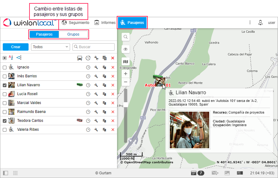 Para gestionar pasajeros, haga clic en la pestaña Pasajeros en la barra de herramientas superior o escoja el punto del mismo nombre en el menú principal. Para gestionar grupos de pasajeros, active el modo Grupos.