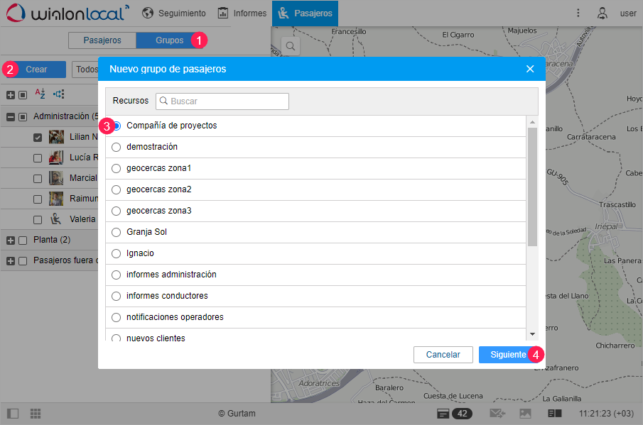 Expanda la línea del grupo para ver los pasajeros incluidos y realizar acciones con ellos. Para que todos los pasajeros del grupo se muestren en el mapa, márquelo en la lista.