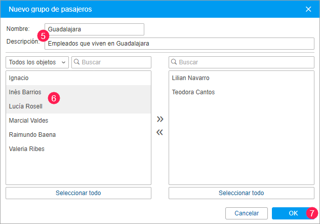Escoja los pasajeros que deben formar parte del grupo. Para ello, seleccione los pasajeros en la lista izquierda y trasládelos a la lista derecha usando el icono