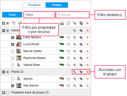 . Para facilitar la búsqueda del grupo necesario, emplee el filtro dinámico o filtro por propiedad (pasajeros asignados o no asignados) o por recurso.