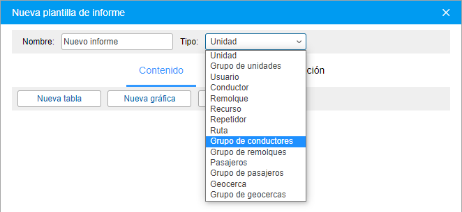Para elegir el tipo del informe avanzado, utilice la lista desplegable Tipo.