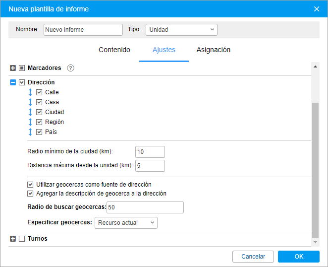 También se puede ampliar o reducir la lista de geocercas utilizadas en función de direcciones. Por defecto se utilizan las que pertenecen al mismo recurso que la plantilla de informe. Sin embargo, se puede utilizar todos los recursos disponibles al usuario actual o, viceversa, restringirse por un grupo de geocercas concreto (tiene que pertenecer al mismo recurso que la plantilla de informe). La variante necesaria se escoge en la lista desplegable Especificar geocercas (los grupos de geocercas van entre corchetes).