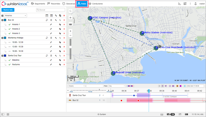 Wialon permite seguir las unidades que van por una ruta con varios puntos de control que tienen que visitar en una consecuencia dada o libre, según un horario o sin él.