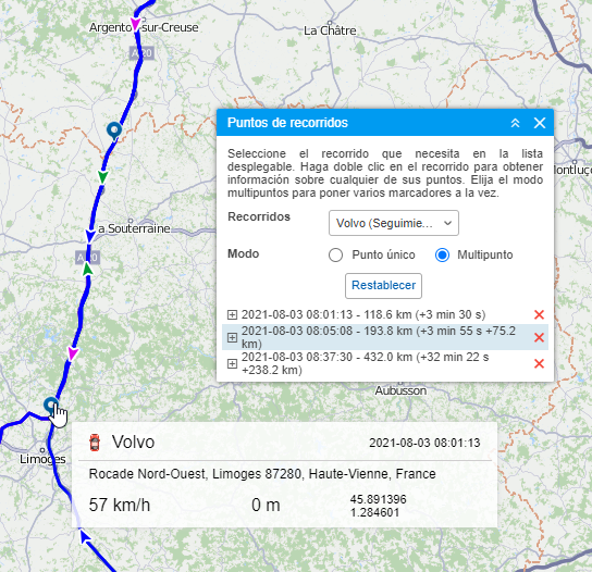 Si está elegido el modo multipunto, se puede indicar varios puntos en el recorrido al mismo tiempo. El punto activo (elegido) está indicado por el marcador azul, los demás — por marcadores rojos. Además, el punto activo se destaca en la tabla por el color azul. La navegación entre los puntos se ejecuta por un clic en el marcador del punto o en la línea necesaria en la tabla. En la tabla se muestra la distancia entre el punto inicial del recorrido y entre paréntesis — el desplazamiento en tiempo y la distancia desde el punto anterior.