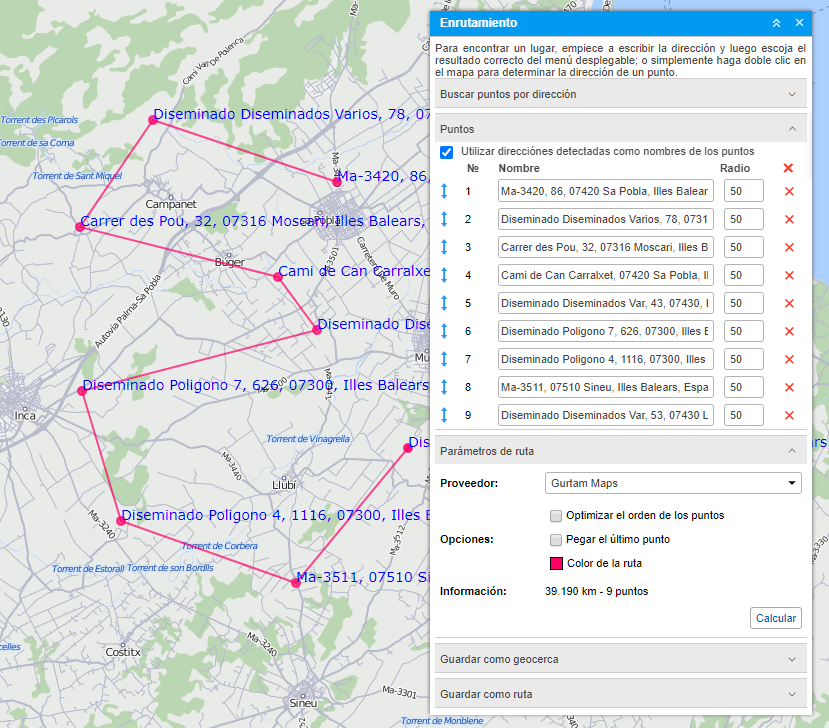 El cálculo de la ruta permite construir la ruta entre los puntos tomando en cuenta las vías existentes.