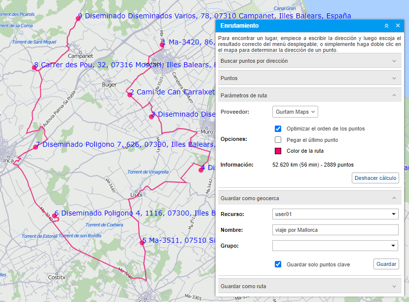 Una vez construida la ruta, se puede guardarla como una geocerca o una ruta. La sección Guardar como geocerca se abre automáticamente después del cálculo. En esta hay que introducir el nombre de la geocerca, escoger el recurso (si hay acceso a varios) y el grupo el geocercas (si se quiere incluir la geocerca creada en un grupo existente) y apretar Guardar.
