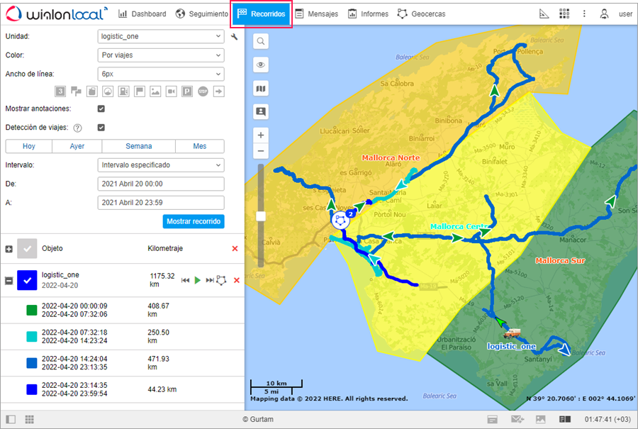 En el mapa se puede trazar cualquier número de recorridos. Éstos pueden representar una o varias unidades en varios intervalos de tiempo. Para evitar confusión entre los recorridos, usted puede asignarlos diferentes colores. Además, varios segmentos de un recorrido pueden tener colores diferentes de acuerdo con los valores de velocidad y otros sensores.