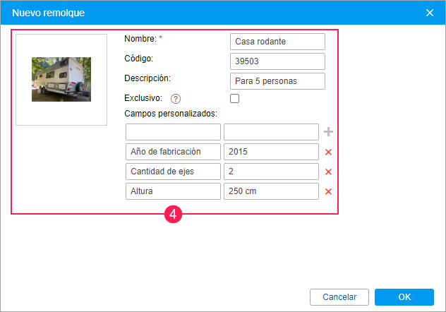 Indique las propiedades del remolque: nombre, código de asignación automática, descripción. Si es necesario, active la opción Exclusivo, añada campos personalizados y cargue una fotografía de formato PNG, JPG, GIF o SVG. Todas las propiedades de remolques son idénticas a las propiedades de conductores.