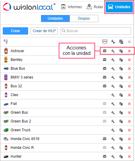 Al lado del nombre de la unidad se encuentran los iconos con los que puede realizar las siguientes acciones: