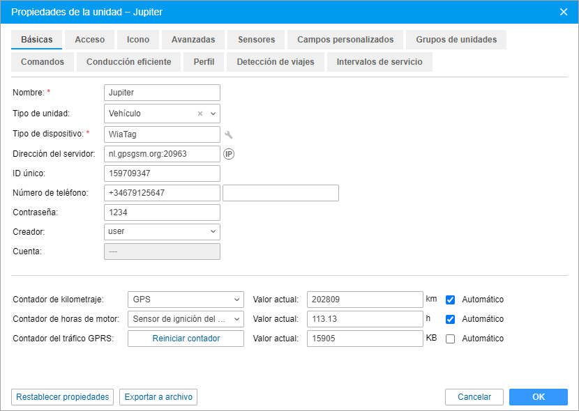 La ventana de propiedades de unidad se muestra al crear, modificar y copiar una unidad. En la ventana, puede indicar diferentes parámetros de la unidad, configurar acceso a la misma, crear sensores, etc.