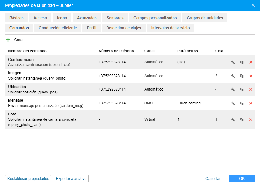 En la pestaña Comandos se puede crear y configurar comandos para enviarlos luego a la unidad.