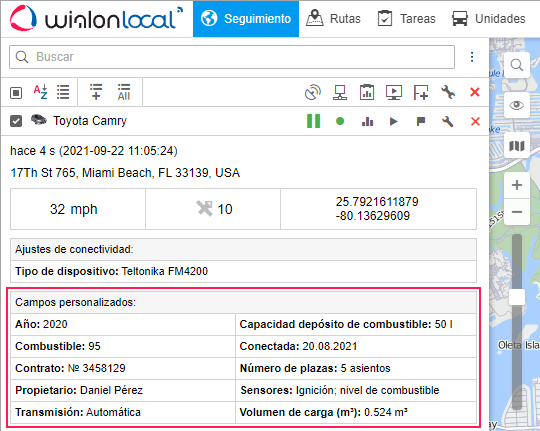 activar la opción Campos personalizados en los parámetros del usuario para que los campos personalizados creados y sus valores se muestren en la descripción emergente de la unidad y en la información ampliada de la unidad en la pestaña Seguimiento;