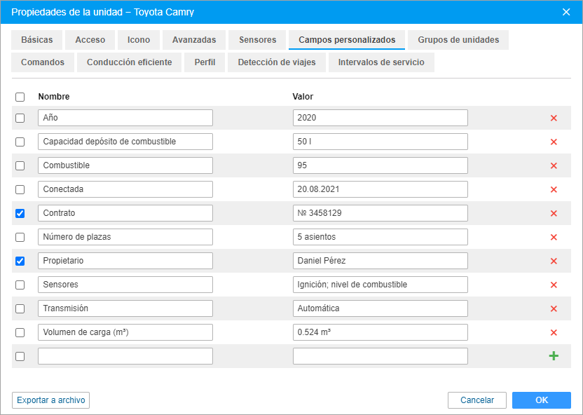 En esta pestaña se puede crear campos personalizados con información adicional sobre la unidad (por ejemplo, año de fabricación, tipo de combustible, cilindrada de motor, etc.).