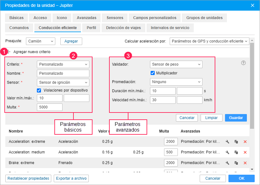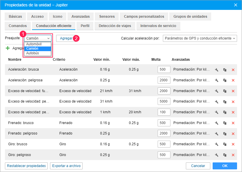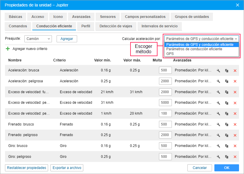 En esta pestaña se puede escoger el método que debe emplearse para calcular aceleración y agregar criterios que permiten evaluar la calidad de conducción y detectar infracciones. Es necesario para mejorar la seguridad de conducción, asegurar la preservación de mercancías transportadas y reducir los gastos de combustible.