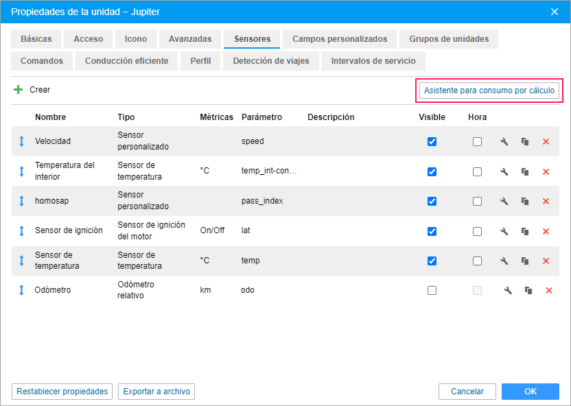 Para abrir el asistente para consumo por cálculo, apriete el botón correspondiente en el rincón derecho superior de la pestaña Sensores de las propiedades de unidad.
