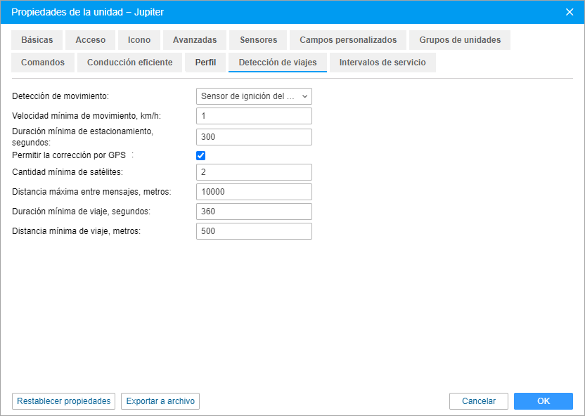 | Cantidad mínima de satélites | Indique el número mínimo de satélites disponibles para detectar un viaje. El valor recomendado es no menos de cuatro. |