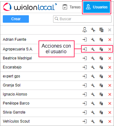 En la pestaña Usuarios se muestra la lista de todos los usuarios disponibles. Puede realizar las siguientes acciones con ellos: modificar o ver propiedades, copiar y eliminar. También puede crear nuevos usuarios y acceder al sistema como un usuario de la lista si usted tiene derechos de acceso necesarios. En la pestaña hay búsqueda dinámica por nombre de usuario.