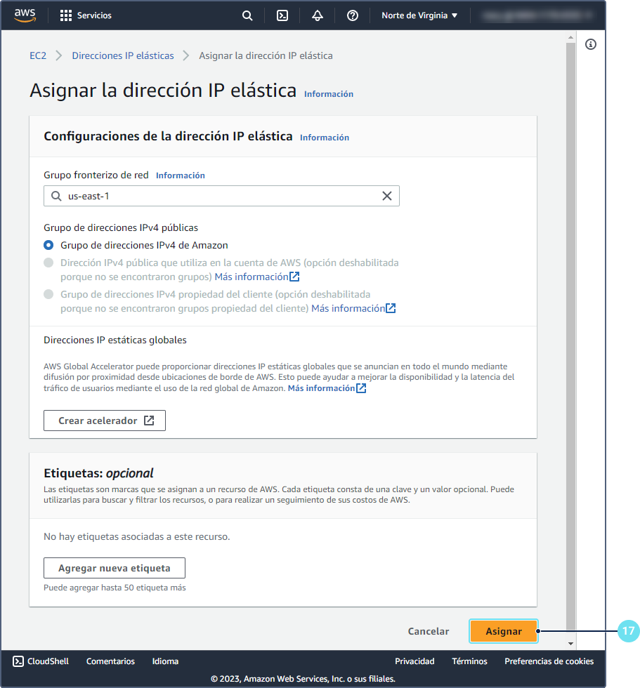 Abra la pestaña Direcciones IP elásticas y apriete el botón Asignar la dirección IP elástica.