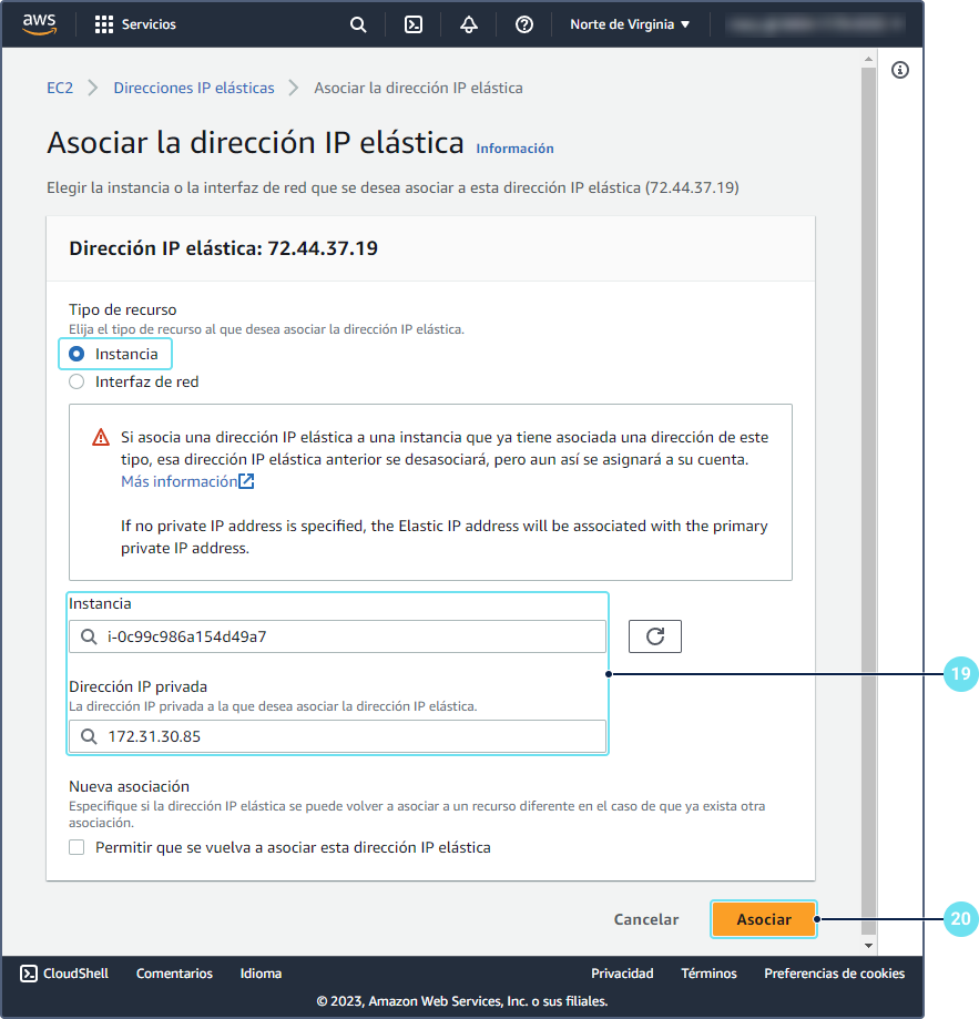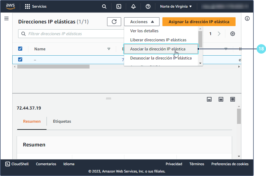 En el menú Acciones, seleccione Asociar la dirección IP elástica.