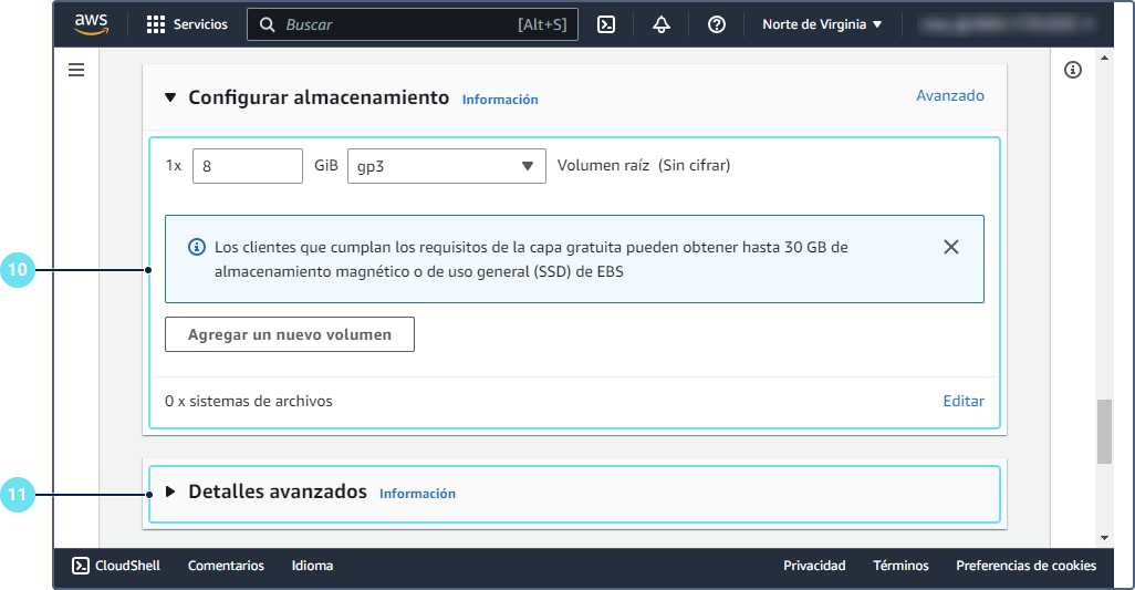Seleccione el tamaño y tipo del almacenamiento.