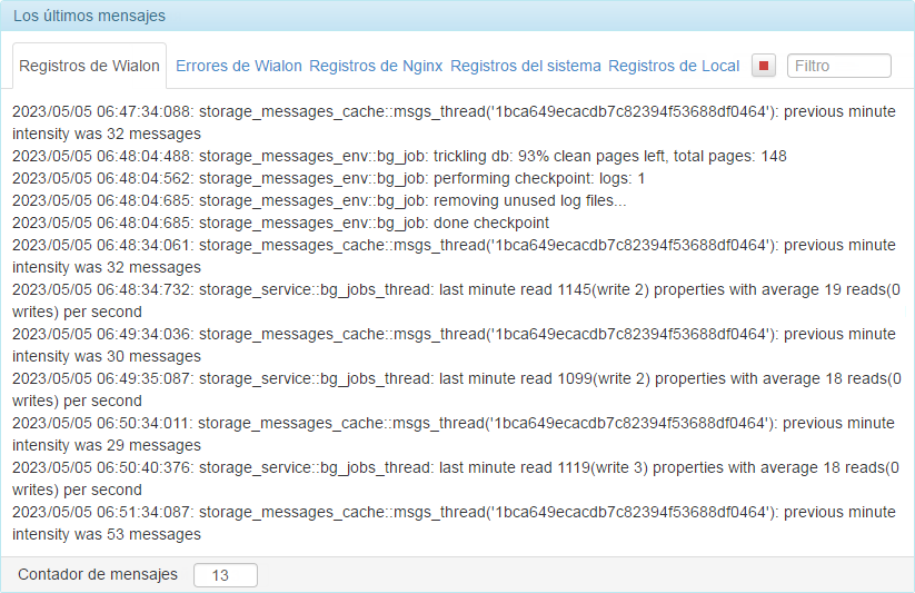 También se puede ajustar la cantidad de líneas que se muestran en el registro. Para hacerlo, introduzca el número necesario en el campo Contador de mensajes situado abajo (equivale a la utilidad tail).