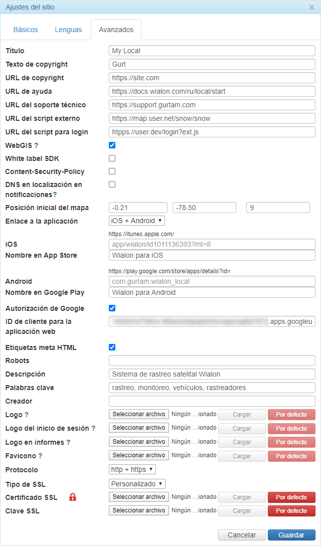 | Protocolo | Protocolo a utilizar (http, http+https, https). Para el protocolo https, se puede agregar un certificado SSL y una clave SSL. En caso de utilizar el certificado SSL, indique su tipo (Personalizado, Let's Encrypt o Autofirmado). Si se han elegido los tipos Let's Encrypt o Autofirmado, no es necesario cargar el certificado: se generará automáticamente. Para que el sitio Logistics funcione por el protocolo https, es necesario que el sitio (Wialon Web o CMS Manager) indicado en el campo URL Base de la pestaña Básicos funcione por https también (es decir, en el campo Protocolo tiene que tener elegido http+https o https). |