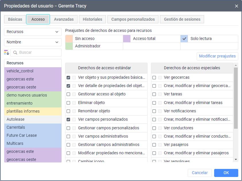 Los derechos especiales son derechos de acceso característicos solo para un tipo determinado de macroobjetos. Por ejemplo, para una unidad se puede establecer el derecho de acceso especial Crear, modificar y eliminar intervalos de servicio; para un usuario, Actuar en nombre del usuario; para un recurso, Crear, modificar y eliminar geocercas, etc.