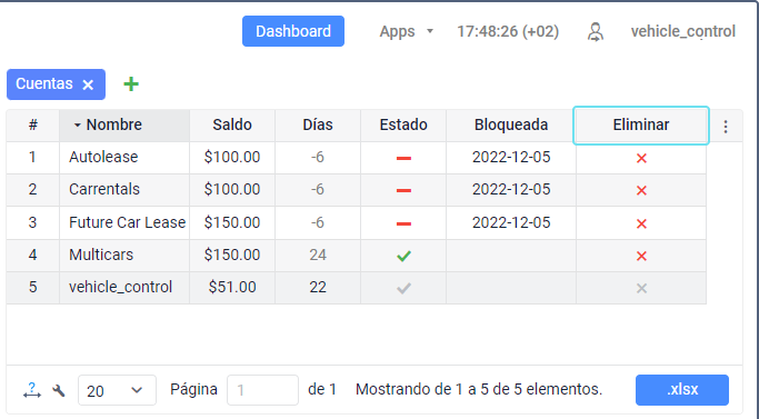 Para eliminar una cuenta, haga clic en el icono   en su línea (columna Eliminar).