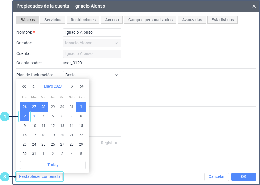 • de la cuenta, para restablecer el contenido del recurso del mismo nombre de la cuenta que se ha creado automáticamente al crear la cuenta;