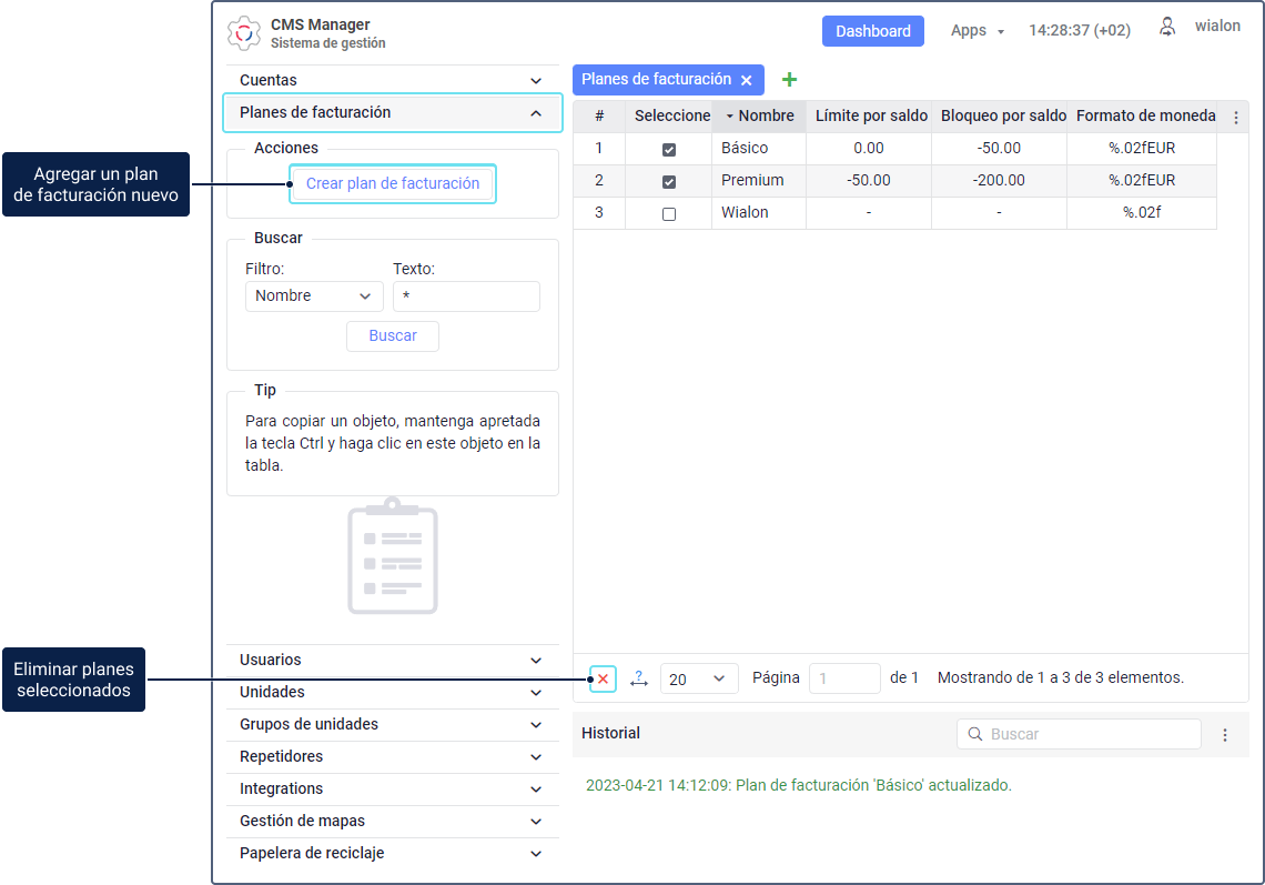 Para gestionar planes de facturación, abra la sección Planes de facturación en la barra de navegación en CMS Manager. Aquí puede crear, modificar, eliminar planes de facturación y buscarlos por su nombre.
