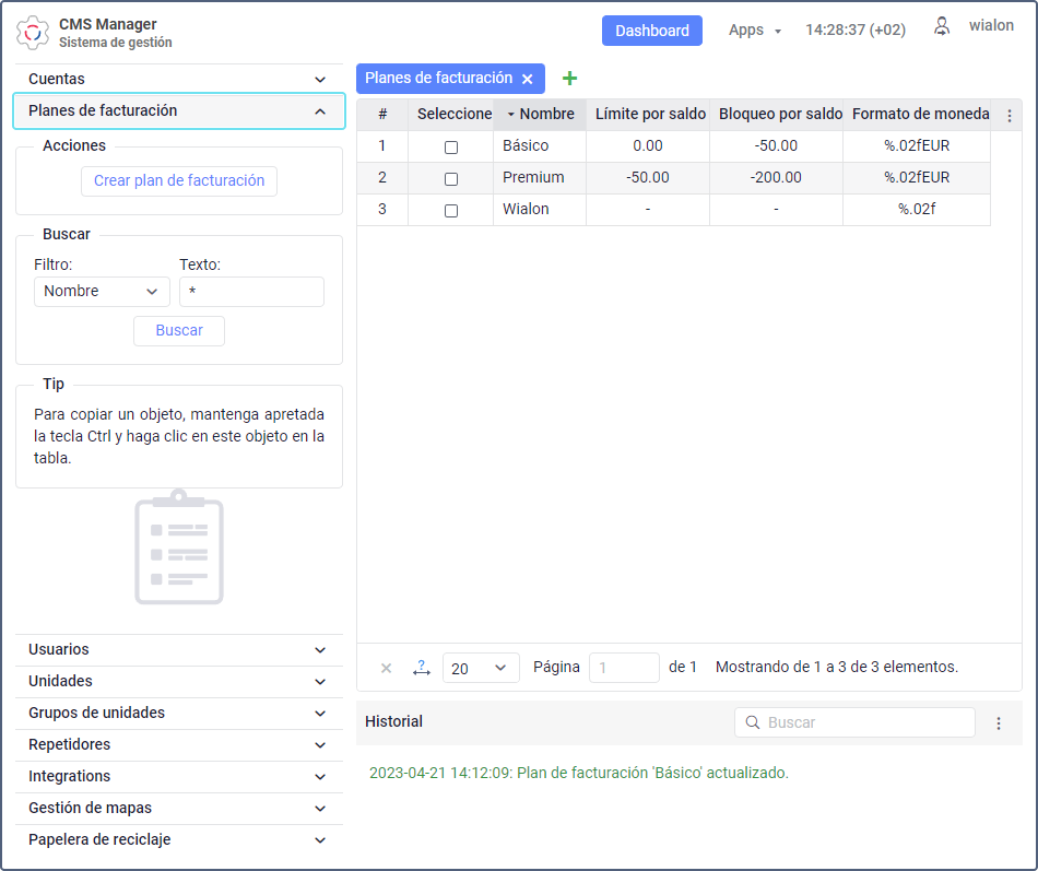Todas las cuentas en el sistema Wialon tienen asignado un plan de facturación. Este sirve para restringir acciones del usuario y tarificar servicios.