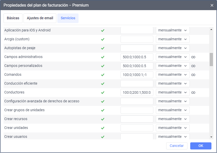 | Límite y coste | En esta columna puede indicar la cantidad y coste de un servicio. Por ejemplo, si para el servicio Unidades está indicada la cantidad 100, esto significa que en las cuentas asignadas a este plan de facturación no se puede crear más de 100 unidades. El límite y coste en un plan de facturación se indican de la misma forma que en una cuenta. Puede indicar el límite y coste de servicios individualmente para cada cuenta en sus propiedades en la pestaña Servicios. Estos valores pueden ser mayores que los de propiedades del plan de facturación, pero no mayores que los valores de la columna Límite. |